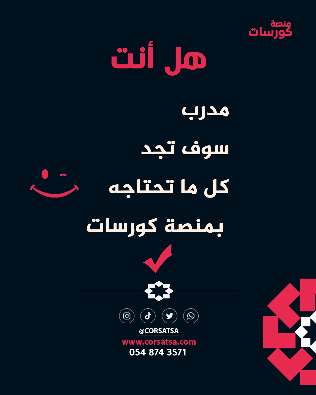 فريق منصة "كورسات" يتابع بإعجاب شديد المحتوى التدريبي المتميز الذي تقدمه، ونرى في خبرتك وإبداعك فرصة ذهبية لشراكة مثمرة.